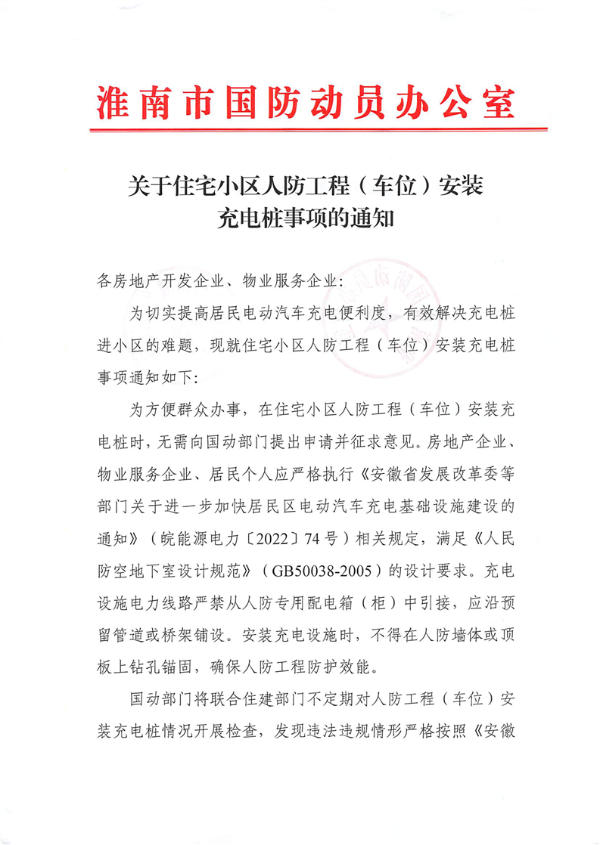 关于住宅小区人防工程(车位)安装充电桩事项的通知